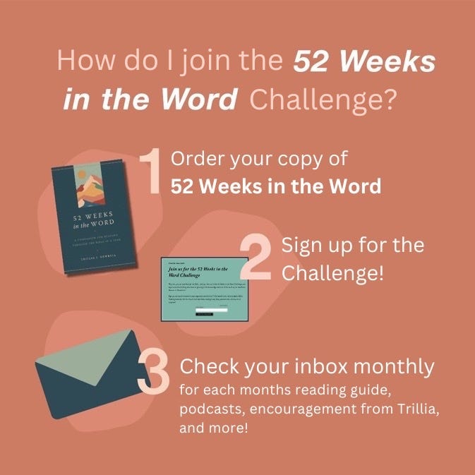 You’ll start receiving new posts right here in your inbox as you embark on this 12 month journey with us. Each monthly post includes as encouragement from Trillia herself with a downloadable Bible Reading Calendar for the month, alongside Trillia’s best bible reading/study tips, podcast links, and more fun surprises!
